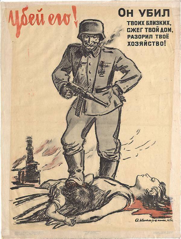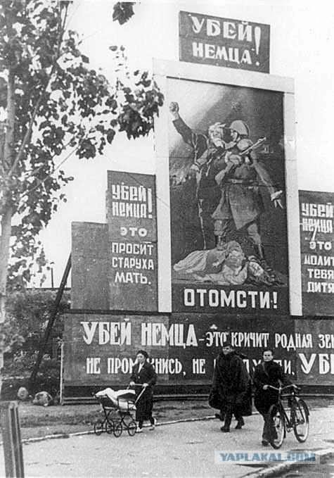 А вот слова великого Ильи Эренбурга «Мы поняли: немцы не люди. Отныне слово «немец» для нас самое страшное проклятье. Отныне слово «немец» разряжает ружье. Не будем говорить. Не будем возмущаться. Будем убивать».