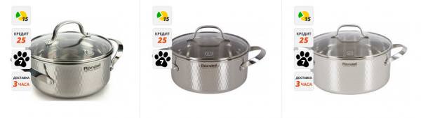 Кастрюли компании Rondell отличаются экологически чистыми материалами, которые используются в производстве. Качество отмечено как хозяйками, так и профессиональными кулинарами. Дно кастрюли тройное, штампованное - 5 мм толщиной, некоторые хозяйки даже используют их в качестве сковороды для обжаривания мяса и других продуктов. Кнопочные крепления прочные, сами ручки удобные и практически не нагреваются при готовке. Внутри имеются насечки мерной шкалы, кастрюля совместима со всеми плитами, имеет в крышке отверстие для пара, и в целом удовлетворит любую хозяйку, тем более что цены соответствующие.