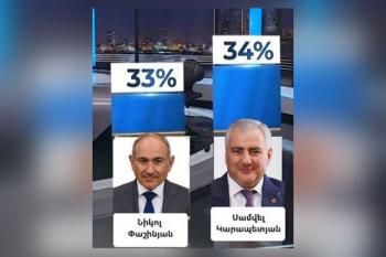 Самвел Карапетян – 34% голосов избирателей, Никол Пашинян – 33%: таковы окончательные результаты опроса, полученные сегодня. Об этом в соцсетях написал координатор движения «По-нашему» Нарек Карапетян.