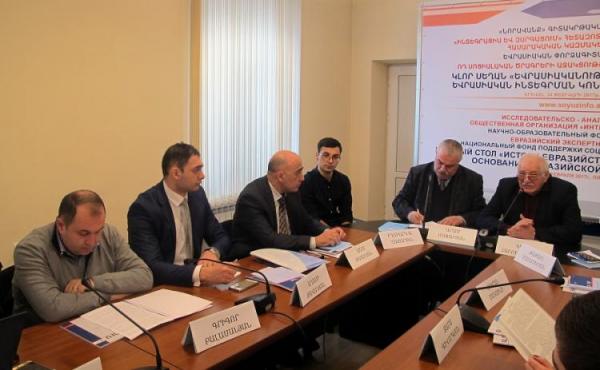 Евразийскую проблематику обсудили известные ученые и эксперты в ходе круглого стола "Истоки евразийства и концептуальные основания евразийской интеграции", организованного исследовательско- аналитической общественной организацией "Интеграция и развитие", научно-образовательным фондом "Нораванк", Евразийским экспертным клубом и Национальным фондом поддержки социальных программ РФ, и прошедшего в стенах фонда "Нораванк". Причем это только начало: вышеупомянутые организации планируют в течение 2017 года провести еще несколько подобных мероприятий с целью привлечения внимания заинтересованных кругов, студентов, молодых армянских ученых и аналитиков к вопросам евразийской интеграции.
