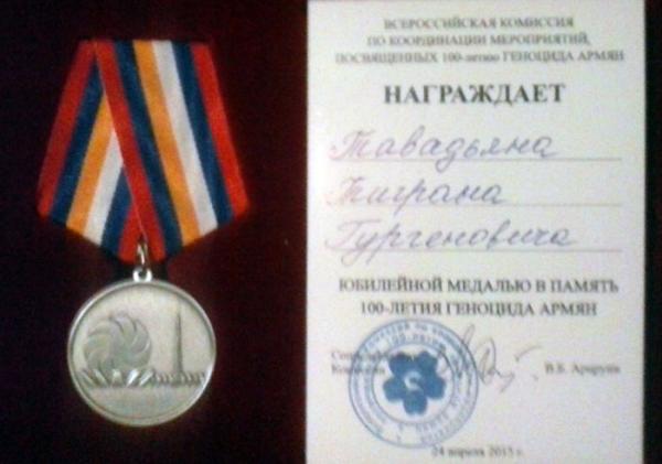Юбилейной медалью за вклад в дело признания и осуждения Геноцида армян в Османской Турции награжден главный редактор газеты армян России «Еркрамас» Тигран Тавадьян.