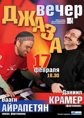 На сцене Тольяттинской филармонии 22 февраля в 19.00 выступят джазовые музыканты Ваагн Айрапетян и Даниил Крамер, которые исполнят She drinks whisky all the time и другие джазовые шлягеры. Как сообщает Информационный Центр газеты армян России «Еркрамас», подобный концерт состоялся 17 февраля и в Самаре.