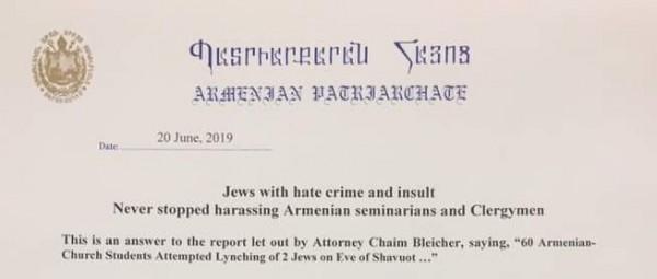 «Евреи своими преступлениями на почве ненависти и плевками никогда не прекращали преследовать армянских семинаристов и священнослужителей». Ниже приводим перевод данного заявления без сокращений.