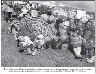 ЖИТЕЛИ ДВУХ СЕЛ СГРУДИЛИСЬ В ПОДВАЛАХ ДОМОВ НА ЦЕНТРАЛЬНЫХ УЛИЦАХ ГЕТАШЕНА. Иным удалось в темноте проскочить в лес, но там они опять же попали под пулеметный и автоматный обстрел. Лишь 22 мартунашенца и 28 геташенцев сумели пробраться по лесным и горным тропам в Шаумяновск: старики, женщины, подростки - "боевики".
