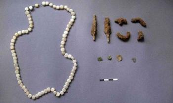 «На месте мы выявили, что это действительно кувшинное погребение. Правда, оно было почти разрушено, точнее верхняя часть самого кувшина была открыта, и очень четко был виден довольно мощный скелет, скорченного на правом боку погребенного. В кувшине были обнаружены бусы из стекла, очень распространенные в период II-I века до н.э. Были выявлены два железных наконечника стрел, железная пряжка, и несколько бронзовых пуговиц. Еще мы нашли датирующий артефакт - в частности у горла большого кувшина находился расписной сосуд, типа «ойнахои», который тоже относится именно ко II-I века. до. н.э.», - сообщил историк.