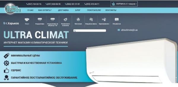 Интерфейс сайта ultraclimate.com.ua простой и понятный, все предложения рассортированы по разделам и категориям. В каталоге предложены кондиционеры, в том числе на обогрев до -25с, увлажнители и очистители, вентиляция, воздушные завесы, водонагреватели и обогреватели. Компания Ультраклимат предоставляет услуги по техобслуживанию, установке, чистке, заправке, диагностике и ремонту кондиционеров. Магазин работает на протяжении нескольких лет, успев за время деятельности завоевать расположение и доверие клиентов. «Ультраклимат» отличает:
