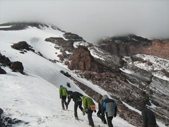 Муса приглашает всех позавтракать в большом шатре. Горячий чай бодрит, сон бесследно исчезает, и все мысли только об одном - о вершине. В половине третьего начинаем восхождение по крутой каменистой тропе. Удивительно, как Муса находит тропинку в темноте и в густом тумане. Примерно через час начинает светать, фонарики отключаем и продолжаем подъем уже по довольно отчетливой тропе. Через три часа выходим на ледник, по снегу идти легче, но порывистый ветер в лицо мешает продвижению.