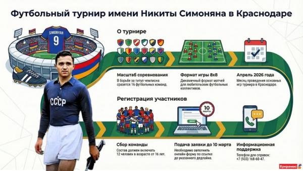 Турнир по футболу имени Никиты Симоняна впервые пройдет в Краснодаре. Организаторы соревнования - Местное отделение Союза армян России города Краснодара, приглашают любителей футбола принять участие в крупном армянском спортивном проекте.