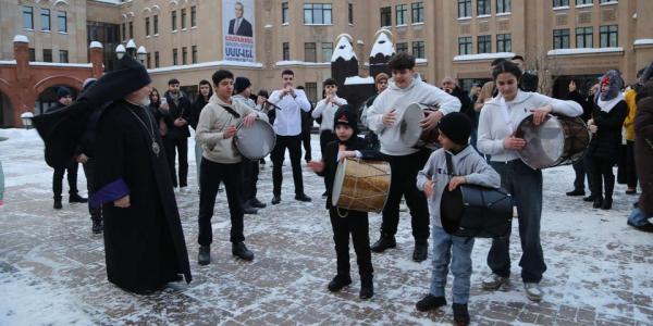 После получения благословения в кафедральном соборе Преображения Господня молодежь направилась в музей «Тапан». Несмотря на январскую стужу, когда даже дыхание на улице дается с трудом, во дворе церкви воспитанники кружков дудука и дхола ДПЦ «Айордеац тун» сумели создать для присутствующих по-настоящему праздничную атмосферу.