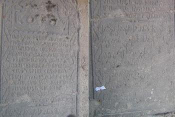 Но 2011-ый год стал роковым для одной из них. У входа в церковь, точнее говоря, несколько правее находилась надгробная плита, на которой отчётливо виднелись армянская и грузинская надписи: