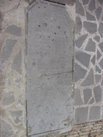 Как видно, проводя ремонт прицерковной территории, рабочие немного изменили её, судя по новой каменной плитке; а также «обновили» вид старого надгробия, сделав его безымянным. Судя по уже бывшей надписи, где отчётливо виден 1860 год, это надгробная плита 19-го века.