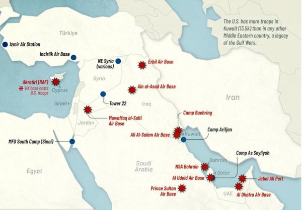 Помните, как эта команда пропагандистов уверяла нас, что Трамп нас защитит, обеспечит нашу безопасность, так как у нас есть его номер Ватсапа? Внизу карта американских баз в Персидском заливе, которые подверглись атакам Ирана. У США есть военные базы на территории своих союзников: в Бахрейне, Кувейте, Катаре, Саудовской Аравии, ОАЭ и Омане. Не говоря уже о консульствах и посольствах по всему региону.