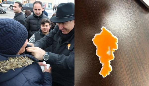 Теперь смотрите. Пашинян все время говорит о «суверенной, международно признанной» территории Армении без Арцаха и одновременно подкрепляет этот текст зрительным образом, нацепляя на грудь значки в виде карты Армении без Арцаха. А карта, как известно, обладает огромной эффективностью, «вступает в диалог» с человеком, создавая в воображении человека именно тот образ, который нужен манипулятору.