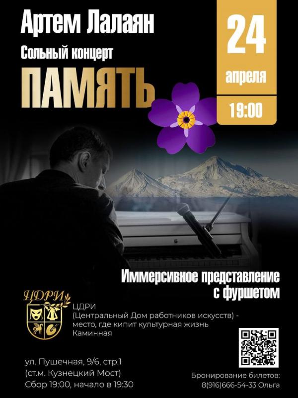 24 апреля в Москва пройдет сольный концерт «Память» Артёма Лалаяна, приуроченный ко Дню памяти жертв Геноцида армян в Османской Турции. Мероприятие станет не только музыкальным событием, но и важным актом исторической памяти.