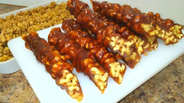 Последующие действия в изготовлении лакомства не имели значимых различий: разрезанные пополам ядра грецких орехов нанизывались на нитки длиной около 80 см и подвешивались для подсушивания, через несколько дней связки орехов опускались в горячую виноградную (абрикосовую) массу, затем сушились в течение 10–12 суток, разрезались на 20–30-сантиметровые куски, посыпались мукой и укладывались на хранение.