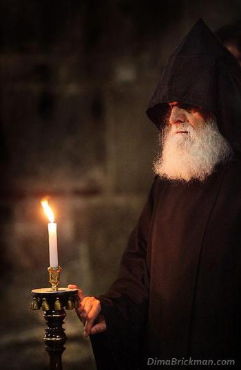 Я уже имел ранее возможность снимать армянские службы в церкви св. Якова и, честно говоря, ничего хорошего (с точки зрения технического качества фотографий, разумеется) не ожидал. Согласитесь, что очень трудно фотографировать черноволосых и чернобородых мужчин, одетых во все черное, с низко надвинутыми на лоб черными остроконечными клобуками, при полностью выключенном свете и наличии примерно трех десятков свечей и лампад, дающих тусклый свет на стены и иконы, но никак не на лица. Да еще и находиться при этом на расстоянии десяти метров от людей, чтобы не мешать службе. В такой ситуации никакой Canon или Nikon не помогут.