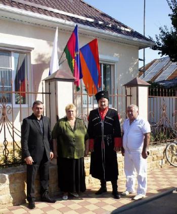 У здания Старокорсунского Армянского Культурного Центра. Слева направо: председатель Пашковского Армянского Культурного Центра г. Краснодара Геворг Серобян, глава администрации Старокорсунского сельского округа Галина Комирняя, атаман Старокорсунского казачьего общества Николай Островерхов, председатель Старокорсунского Армянского Культурного Центра Хачатур Докторян.