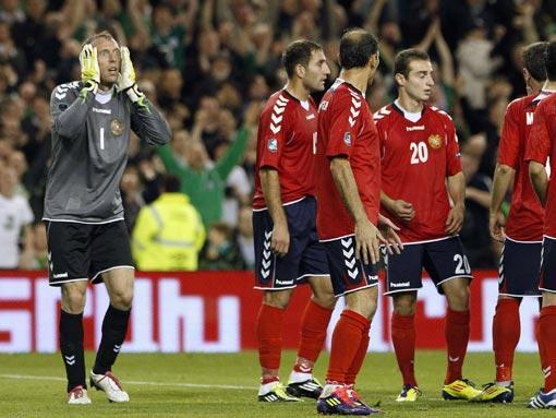 Еще раз прокрутим эпизод, случившийся на 26‑й минуте матча: нападающий ирландцев Кокс, подыграв себе рукой, выходит один на один с Березовским, бьет и попадает тому в грудь. Арбитр, посоветовавшись по связи с ассистентом, предъявляет вратарю красную карточку, узрев игру рукой вне пределов штрафной площади. Игра, обнадеживающе складывающаяся для армянской сборной, оказалась сломана.