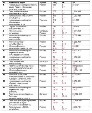 В рейтинге учитывались сайты информационной направленности, предлагающие читателям не только перепечатки из СМИ Армении, но и собственные материалы, касающиеся информации из Диаспоры. В качестве показателей популярности сайтов учитывались такие известные индикаторы, как ТИЦ (Тематический Индекс Цитирования), PR (PageRank или пэйдж-ранк) и AR (Alexa Rank).