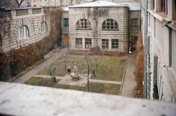 Внутренний дворик особняка, в котором в 2007 году снимались сцены нацистской Германии для телесериала «Апостол». Сотрудники института рассказывают, как декораторы повесили фигурку кренделя, обозначающую булочную, и свастику, а также загнали сюда машину, использовавшуюся еще на съемках «17 мгновений весны»