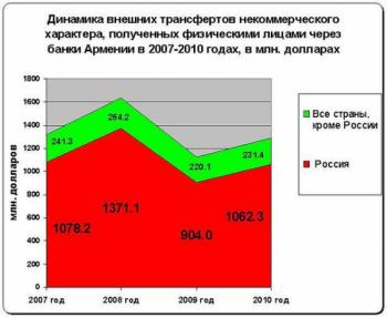 В 2008 году общая сумма этих денежных переводов составила более $1,6 млрд., а вот в следующем, 2009 году, она сократилась на $530 млн., или же на 31,3%. Нет необходимости разъяснять, к каким последствиям привело сокращение почти на одну треть суммы трансфертов, как для семей, получающих оные, так и для отечественного бизнеса.