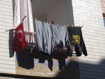 Турецкий флаг здесь вещь первой необходимости. Он ВЕЗДЕ – в магазине, в парикмахерской между фотографиями моделей, на бензозаправках.... Проще сказать, где его нет. Думаешь, нам бы так любить свою родину, но все же смущает меня в этом изобилии одно: национальный флаг – это святыня, и глаз мозолить он не должен. Не должен флаг болтаться на веревке вместе с бельем, уподобляясь бытовой тряпке. Тут Ленинское изречение хочется вспомнить – лучше меньше да лучше. Впрочем, о Ленине мы не случайно оговорились....