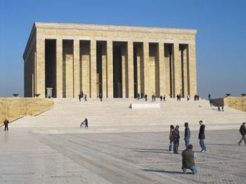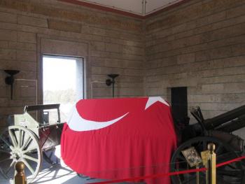 В музее выставлен катафалк, на котором умерший Отец Всех Тюрков был доставлен в Анкару из Стамбула, но больше привлекают внимание многочисленные предметы роскоши – яхта, фешенебельные авто, портсигары и трости, оружие и золотая ручка, инкрустированная бриллиантами... Подарки от делегаций в честь 10-летия Турецкой Республики. Тогда, в 1933 году, делегацию Советского Союза возглавлял Клемент Ворошилов. Великолепной работы с финифтью чайный сервиз привез и что-то еще... Ататюрк в витринах музея уже восковой фигурой поражает воображение, особенно женщин, очень похожий не на политика, а не звезду Голливуда. Смокинги, цилиндры, перчатки... Роскошная библиотека была у него – жаль, никто не пользуется... В сувенирной лавке опять разноликий Ататюрк. На многих фото выглядит, не побоюсь этого слова, как секс-символ. Продается календарь с мозаичным изображением кумира: много-много таких квадратиков составляют лик, и в каждом фрагменте – какой-нибудь эпозод из жизни. Все это уже относит память к майкам с изображением Че Гевары... Растиражированный бренд.