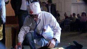 Доктор производит обряд оживления деда–жениха, при этом старается выгнать всех из дома, приговаривая: «Хватит вам пить, есть, веселиться – это человекоубийственно».