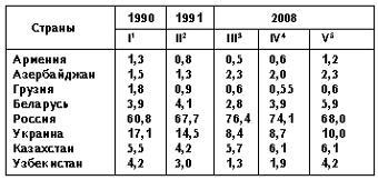 Ведущей страной СНГ была и остается Россия, на долю которой в 1994г. приходилось 66,7%, а в 2010г. - 74,4% ВВП 10 стран СНГ (без Грузии и Туркменистана). Казалось, избавившись от "нахлебников", располагая огромным внутренним рынком и богатейшими природными ресурсами, эта великая страна наподобие Китая должна была выбрать плавный путь трансформации из экономики плановой в рыночную. Но Б.Ельцин и его команда неолибералов оказались разрушителями, отдавая рычаги экономики в руки проходимцев-олигархов путем ваучеризации (прихватизации) общественной собственности.