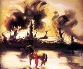 Скромное, лишенное какого-либо стремления к эффекту, к броскости, к внешней красивости, искусство Фрэнка, по мере того как в него вглядываешься, погружает в свой мир. Все так просто, казалось бы, "невыигрышно", но удивительно верно и дорого. Такая пронзительная поэтичность в изображении природы, такая непредвзятость и правдивость во всех этих глухих деревнях, темных силуэтах постоялых дворов, во всей щемящей пустоте ночей и такая правда во всем, что сразу и бесповоротно оказываешься во власти художника, благородно и ненавязчиво погружающего вас в этот мир. Кони, буйволицы, овцы, лесные звери - все они непосредственно и верно живут на холстах... Так опоэтизировано их бытие, пропущенное художником через сердце, что только диву даешься, как собственно анималистическая задача, решаемая вроде бы так бесхитростно, становится под кистью этого мастера Словом о Родине.