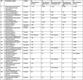 В рейтинг-листе вполне могут быть упущены некоторые из существующих сайтов информационной направленности. Центр этнополитологических исследований приносит свои извинения за возможные упущения и предлагает владельцам не указанных в рейтинг-листе сайтов обратиться с заявкой о внесении пропущенного веб-ресурса в рейтинг следующего месяца. Напоминаем главные критерии, по которому отбирались сайты для рейтинга – информационная направленность и наличие собственной информации, касающейся новостей Диаспоры.
