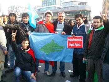 Как легко заметить, большинство явившихся на митинг одеты в белые шапочки, являющие копией головного убора Огюна Самаста – убийцы известного турецкого писателя и журналиста армянского происхождения Гранта Динка. С 19 января 2007 года – дня подлого убийства Гранта, эта шапочка стала одним из символов патриотизма в турецком понимании этого слова. Вообще, героизация убийц – характерная черта турок закавказских и анатолийских; напомню только о массовой истерии, охватившей Азербайджан при известии о том, что офицер вооруженных этого образования зарубил топором спящего офицера Армянской Армии Гургена Маркаряна. В Азербайджане по сей день можно встретить машины, обклеенные фотографиями ночного убийцы Рамиля Сафарова, его именем нарекают новорожденных младенцев обоего пола. И уже совсем нетрудно представить, какую колыбельную поет турчанка у изголовья своих Рамиля или Рамили.