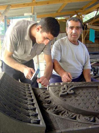 Мастер Камсар Казарьян и его ученик работают над Хачкаром памяти отцов-основателей города Святого Креста