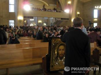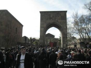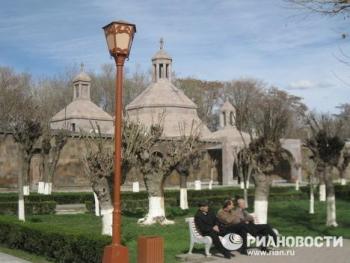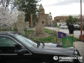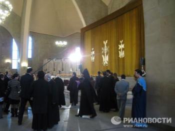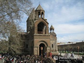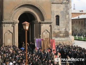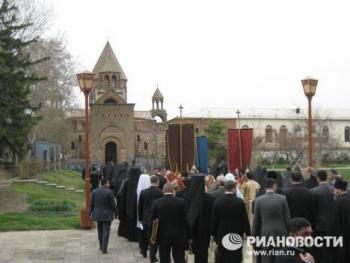 Торжественная процессия с хоругвями под звон древних колоколов сопровождала вход патриархов в кафедральный собор Эчмиадзина - древнейший храм Армении. По преданию, место его строительства указал святому Григорию Просветителю сошедший с небес Господь (этим преданием объясняется и название Эчмиадзин - в переводе "Сошел Единородный"). Историки свидетельствуют, что храм был воздвигнут в IV веке рядом с царским дворцом.