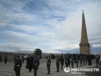 Возложение цветов к памятнику русским воинам, погибшим в битве за Эчмиадзин при Ошакане в период русско-персидской войны 1826-1828 годов. Мемориальная надпись на русском языке гласит: «В августе 1827 года Аббас Мирза, нарушая перемирие… со своим 30-тысячным войском направился к Эчмиадзину с целью завоевать город. Трехтысячное войско генерал-лейтенанта Красовского вместе со многими армянскими добровольцами в битвах на юге Ошакана 17 августа 1827 года одержало победу над персидским войском и таким образом провалило планы Аббас Мирзы». В сражении были убиты более 1130 русских воинов. В 1833-34 годах по инициативе армянских духовных лидеров в честь погибших солдат был воздвигнут памятник высотой 25 метров.
