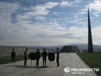 Патриарх Кирилл почтил память жертв Геноцида армян в Османской империи, возложив венок к мемориалу Цицернакаберд в Ереване. Мемориал Цицернакаберд возведен на одноименном холме, название которого в переводе означает "Крепость ласточки", в 1965-67 годах. Стела высотой 44 метра символизирует волю к возрождению армянского народа, а протянувшийся в ней от основания до вершины глубокий разлом - раскол армянского народа, большая часть которого живет в диаспоре. 12 больших каменных плит рядом со стелой образуют конус, в центре которого горит Вечный огонь. Вдоль дороги к нему возведена 100-метровая стена - на ней высечены названия армянских городов и сел, население которых было истреблено.
