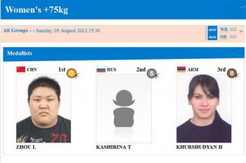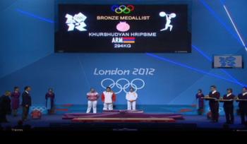 Представитель сборной Армении по тяжелой атлетике, чемпионка Европы 2007 г. и бронзовый призер чемпионата мира 2009 г. Рипсиме Хуршудян (75 кг) достойно выступила сегодня на помосте лондонской Олимпиады, завоевав для Армении бронзовую медаль.