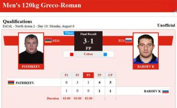 Спортсмен из Армении Юрий Патрикеев (120 кг) в схватке со своим самым принципиальным соперником – Хасаном Бароевым из России одержал победу и вышел в 1/8 олимпийских соревнований по греко-римской борьбе.