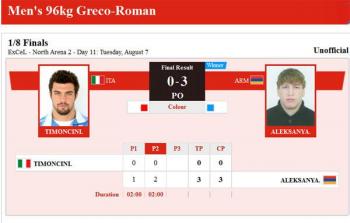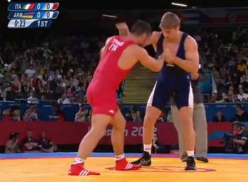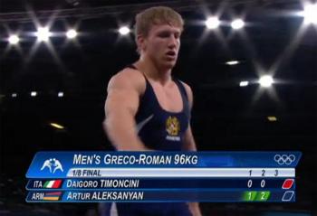 Борец греко-римского стиля из Армении Артур Алексанян (96 кг) в своей первой схватке на лондонской Олимпиаде одержал уверенную победу над итальянцем Диагоро Тимончини и вышел в четвертьфинал соревнований.