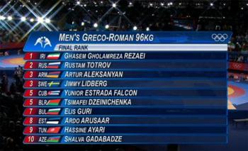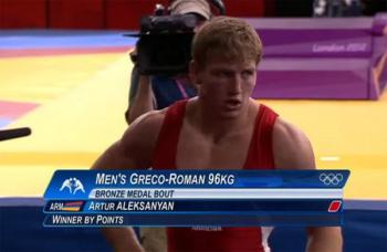 Как сообщает Информационный Центр газеты армян России «Еркрамас», в первом поединке в борьбе за бронзу наш соотечественник одержал победу над борцом из Турции Ченком Илдемом. Напомним также, что в 1/8 финала чемпион Европы 2012 года Артур Алексанян одержал победу над итальянцем Дигоро Тимончини, однако затем, в четвертьфинале, проиграл иранцу Гасему Голамреза Резаеи. Поскольку иранский борец вышел в финал, 22-летний Алексанян получил возможность побороться за бронзу.