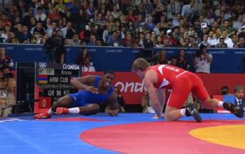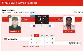 Спортсмен из Армении Артур Алексанян (96 кг) в заключительной схватке за бронзовую медаль в олимпийских соревнованиях по греко-римской борьбе одержал уверенную победу над Юниор Эстрада Фалконом из Кубы.