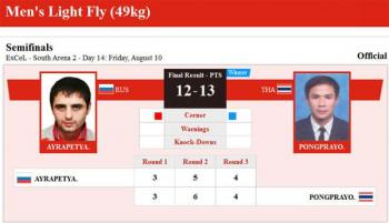 В полуфинальном бою на олимпийских соревнованиях боксеров, представитель Армянской Диаспоры, выступающий за Россию Давид Айрапетян (49 кг), в упорном и равном бою уступил победу Каео Понгпраюну из Таиланда.