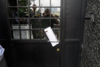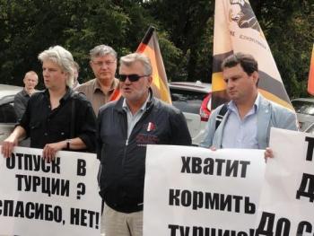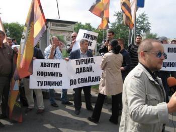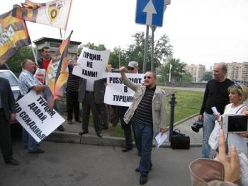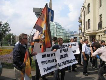 В заключение акции руководитель Информационно-политического отдела КРО Федор Бирюков и член Национального Совета КРО Алексей Рылеев проследовали к главному входу в посольство, чтобы вручить его представителям официальное заявление с требованиями к турецкой стороне. Реакция последней была явно неадекватна, но достаточно типична и вновь наглядно продемонстрировала современное “восточное гостеприимство”, “туристический сервис” и подлинное отношение турецких официальных лиц к российским гражданам. “Сейчас все обедают, подождите”, - донеслось из домофона. Соратники КРО не стали ждать, а прикрепили текст резолюции к посольским дверям, как некогда князь Олег повесил свой боевой щит на воротах Царьграда (нынешний Стамбул).