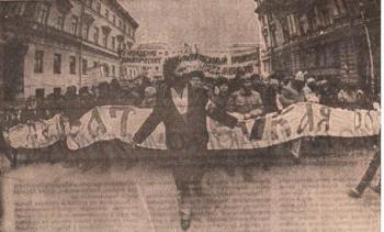 А.Аракелян выводит на Дворцовую площадь демороссов на митинг. 1990 г.