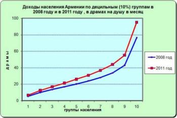 Однако, вследствие разницы в содержании процента, по величине абсолютного прироста доходов богачи намного опередили бедняков. Так, в указанном выше периоде ежемесячный среднедушевой доход у «самых богатых» возрос на 18,7 тыс. драмов, а вот у «самых бедных» этот показатель был менее 1,3 тыс. драмов.