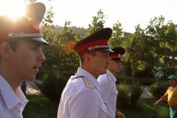 8 утра субботы, Сочи. Людей в городе почти еще нет, а из УВД Центрального района уже вываливается группа молодых людей. Кажется даже, что они все одинаковые — не старше 30, светлая рубашка, темные брюки, фуражки. Правда, у одних рубашки белые, а штаны черные, у других — рубашки голубые, а штаны темно-серые, ну и кокарды на фуражках незначительно отличаются. Первые — казаки, вторые — полицейские. Алкоголикам и бомжам — главным мишеням утреннего патруля — разница, скорее всего, незаметна. Утренняя смена вообще довольно спокойная. Я иду по центру Сочи с Сашей, Димой, Богданом и Ваней. Ваня — самый старший, он сотрудник полиции и смотрит на меня с подозрением. Это из-за критики в адрес идеи губернатора Краснодарского края Александра Ткачева о создании казачьих дружин. Теперь повышенное внимание еще и к полиции. Так что журналистам тут совсем не доверяют — о съемке приходится договариваться чуть ли не за неделю, и с центральным аппаратом МВД. Саша, Дима и Богдан дружелюбнее. Говорят, что студенты, и что обещанные за работу в дружине 25 тысяч рублей в месяц для них хорошие деньги. И не только дня них. По словам Димы, в дружины хотят вступить и совсем не казаки, "евреи и армяне", но их не пускают. "Мы не националисты, но так получается, что основные преступления тут совершают приезжие с Кавказа", — поясняет он. Еще Дима хвастается, что нагайки (кожаной плетки, традиционному оружию казаков) для задержания правонарушителей вполне достаточно, потому что она "как нунчаки".
