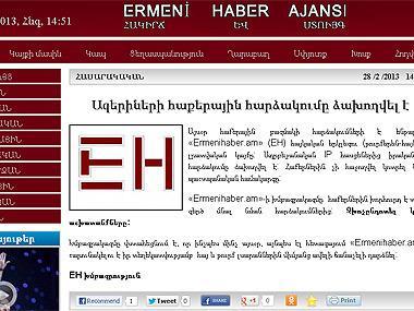 Сегодня неоднократной хакерской атаке подвергся армянский двуязычный (турецкий и армянский) информационный сайт «Ermenihaber.am» (EH). Нападение, совершенное с азербайджанских IP-адресов, не увенчалось успехом. Хакерам не удалось взломать систему защиты сайта.