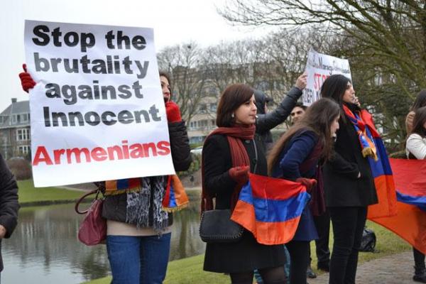 Акция протеста в среду прошла также возле нидерландского посольства Азербайджана, ее участники подготовили плакаты с призывами прекратить азербайджанскую агрессию и признать право народа Нагорного Карабаха на самоопределение.