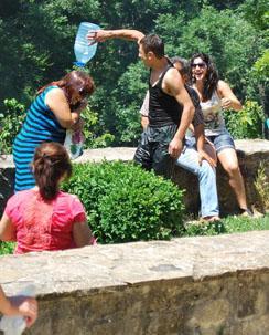 По другой версии, слово «Вардавар» состоит из корней «вард (уард)» - «вода» и «вар» - «мыть, поливать», означает «опрыскивать водой», что и составляет смысл праздника. Согласно дошедшей до нас древней легенде, на свете жил богач, требовавший за пользование принадлежащей ему водой отдавать в рабство юных красавиц. Храбрый юноша Вардан победил злодея и освободил девушек. В этот день принято обливаться водой. Праздник начинается с самого раннего утра. Все поливают друг-друга водой, кто из чего может, невзирая при этом ни на возраст, ни на пол, ни на общественное положения. Обижаться или проявлять недовольство нельзя, потому что считается, что в этот день вода обладает целебной силой.