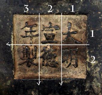 Теперь оставалось уточнить последнее. Я знал, что одна из настоящих бронзовых чаш Сюаньдэ хранится в Столичном музее Пекина, и связался с руководством, запросив фотографию печати с их образца. В результате сравнения действительно обнаружилась разница: на настоящей чаше минского периода в иероглифе de не хватало одной маленькой черточки, которая отчетливо видна на нашем образце. Стало быть, чаша из Гюмри была отлита в период правления императора Канси.